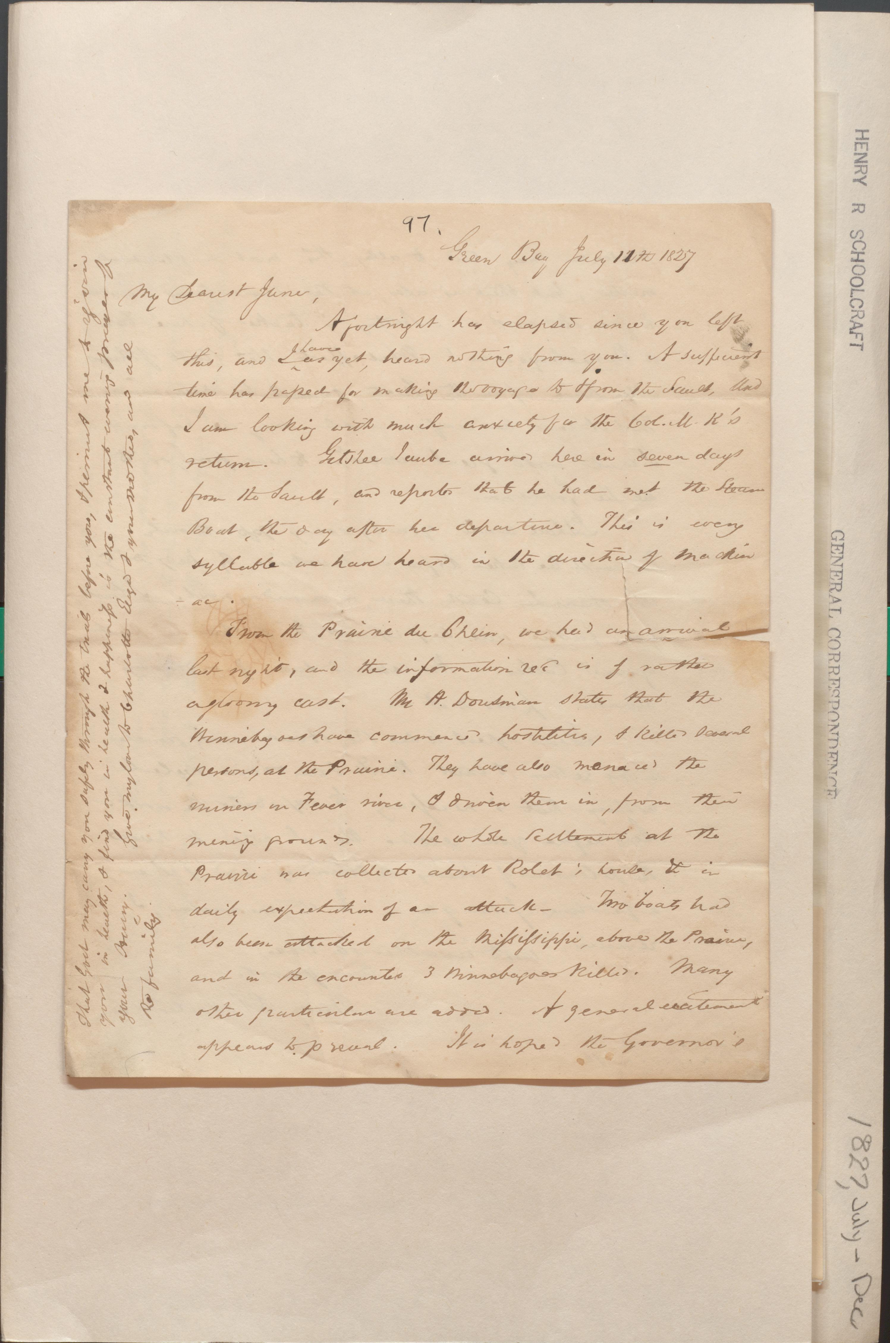 In this letter, Henry Schoolcraft informs Jane Schoolcraft about hostilities from some Winnebago people at Prairie du Chein in Wisconsin.