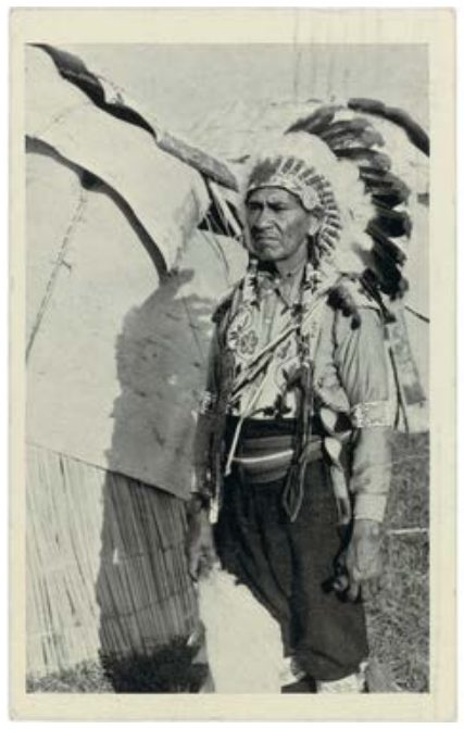 Outdoor portrait of an unidentified man posed in front of a reed structure covered with sheets of birchbark. He is wearing a feather headdress, wrapped braids, plain shirt with beaded epaulets, beaded vest(?), beaded armbands, a woven sash, beaded legbands, feather fan, and holds a pipe with a carved spiral-shaped stem.