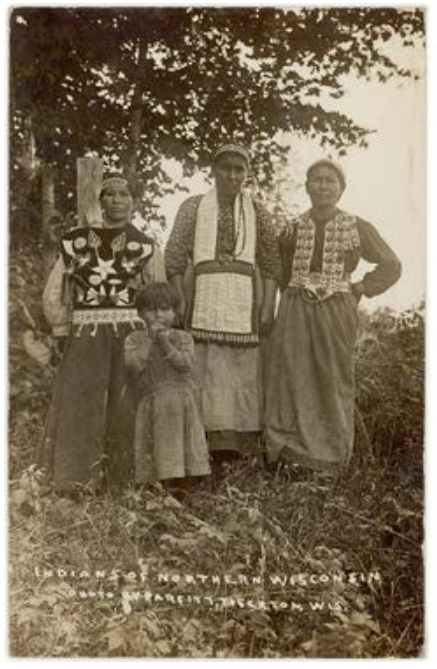 Postcard entitled "Indians of Northern Wisconsin." Three women and child (note unusual bandolier bag worn on front, and elaborately beaded vests.