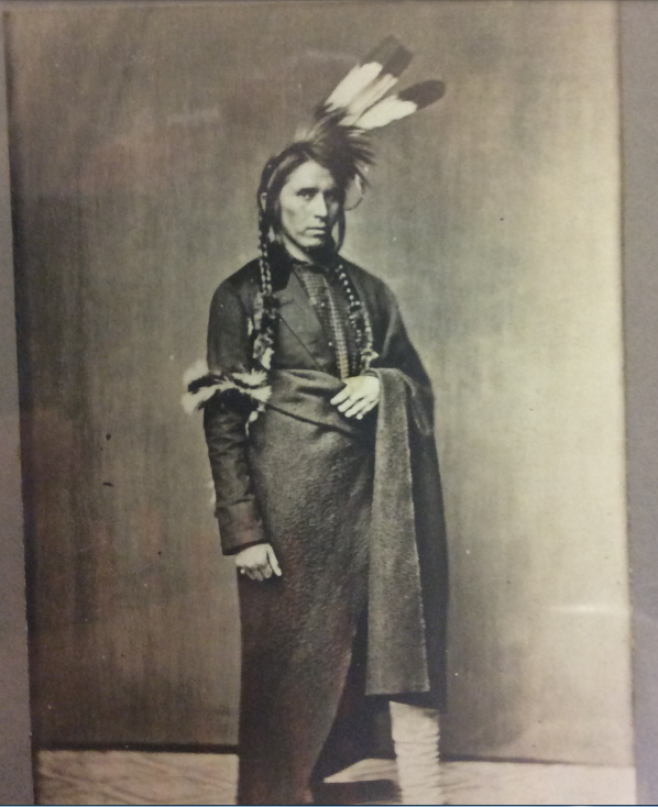 Studio portraits of Ojibwa chief Hole-in-the-Day, wearing blanket over Euro-American clothes and feathers in his hair.