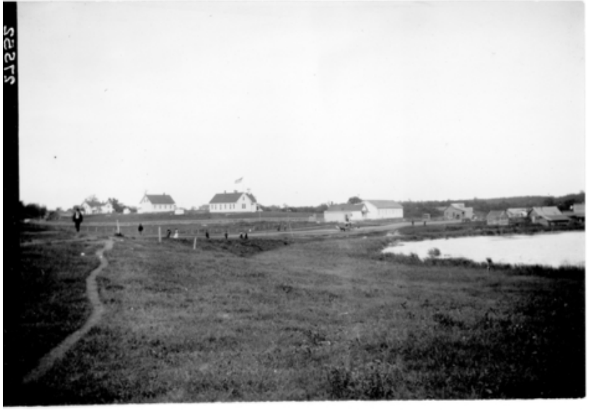 View of Agency buildings at the White Earth Reservation to the left, with a road through the middle of the image---with people walking along---and other buildings (farm buildings?) to the right.